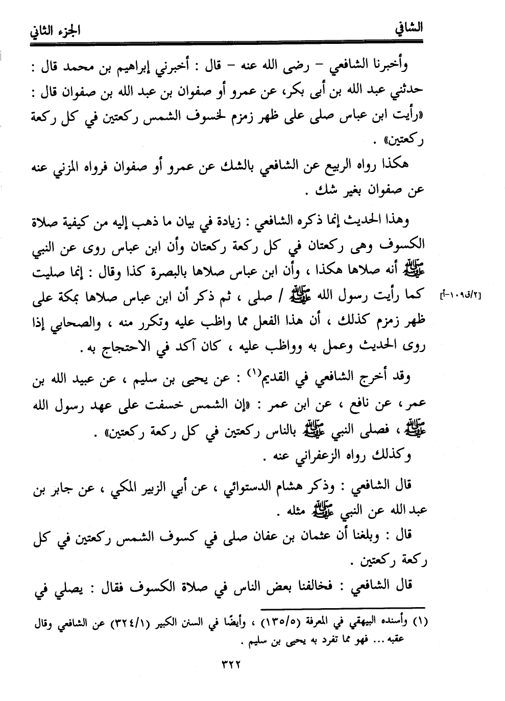 وأخبرنا الشافعي -رضي الله عنه- قال: أخبرني إبراهيم بن محمد قال: حدثني عبد الله بن أبي بكر، عن عمرو أو صفوان بن عبد الله بن صفوان قال: "رأيت ابن عباس صلى على ظهر زمزم لخسوف الشمس ركعتين في كل ركعة ركعتين".