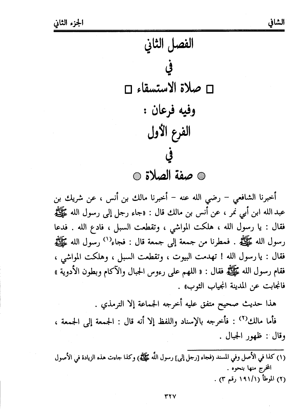 أخبرنا الشافعي -رضي الله عنه- أخبرنا مالك بن أنس، عن شريك بن عبد الله ابن أبي نمر، عن أنس بن مالك قال: "جاء رجل إلى رسول الله - صلى الله عليه وسلم - فقال: يا رسول الله، هلكت المواشي، وتقطعت السبل، فادع الله. فدعا رسول الله - صلى الله عليه وسلم -. فمطرنا من جمعة إلى جمعة قال: فجاء (¬1) رسول الله - صلى الله عليه وسلم - فقال: يا رسول الله! تهدمت البيوت، وتقطعت السبل، وهلكت المواشي، فقام رسول الله - صلى الله عليه وسلم - فقال: "اللهم على رءوس الجبال والآكام وبطون الأدوية" فانجابت عن المدينة انجياب الثوب".