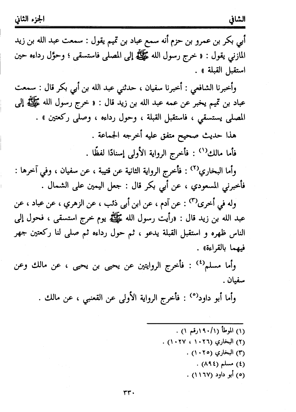 أبي بكر بن عمرو بن حزم أنه سمع عباد بن تميم يقول: سمعت عبد الله بن زيد المازني يقول: "خرج رسول الله - صلى الله عليه وسلم - إلى المصلى فاستسقى؛ وحوَّل رداءه حين استقبل القبلة".