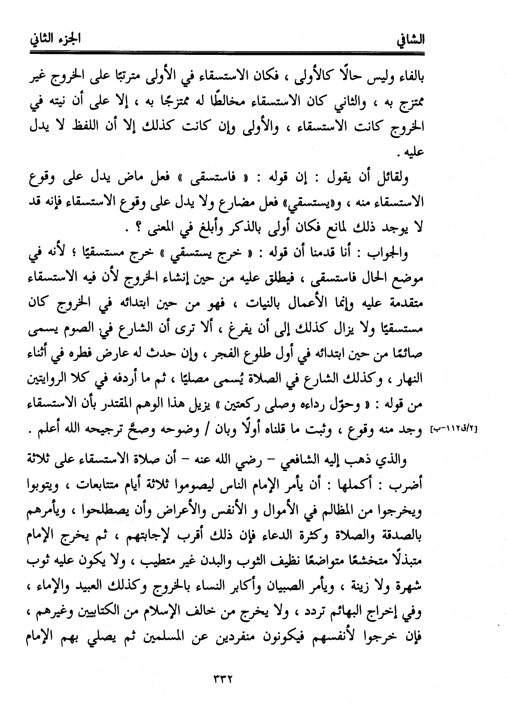 والذي ذهب إليه الشافعي -رضي الله عنه- أن صلاة الاستسقاء على ثلاثة أضرب: أكملها: أن يأمر الإِمام الناس ليصوموا ثلاثة أيام متتابعات، ويتوبوا ويخرجوا من المظالم في الأموال والأنفس والأعراض وأن يصطلحوا، ويأمرهم بالصدقة والصلاة وكثرة الدعاء فإن ذلك أقرب لإجابتهم، ثم يخرج الإِمام متبذلاً متخشعًا متواضعًا نطيف الثوب والبدن غير متطيب، ولا يكون عليه ثوب شهرة ولا زينة، ويأمر الصبيان وأكابر النساء بالخروج وكذلك العبيد والإماء، وفي إخراج البهائم تردد، ولا يخرج من خالف الإِسلام من الكتابيين وغيرهم، فإن خرجوا لأنفسهم فيكونون منفردين عن المسلمين ثم يصلي بهم الإِمام