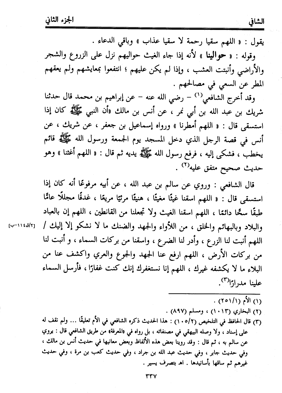 وقد أخرج الشافعي (¬1) -رضي الله عنه- عن إبراهيم بن محمد قال حدثنا شريك بن عبد الله بن أبي نمر، عن أنس بن مالك "أن النبي - صلى الله عليه وسلم - كان إذا استسقى قال: "اللهم أمطرنا" ورواه إسماعيل بن جعفر، عن شريك، عن أنس في قصة الرجل الذي دخل المسجد يوم الجمعة ورسول الله - صلى الله عليه وسلم - قائم يخطب، فشكى إليه، فرفع رسول الله - صلى الله عليه وسلم - يديه ثم قال: "اللهم أغثنا" وهو حديث صحيح متفق عليه (¬2).