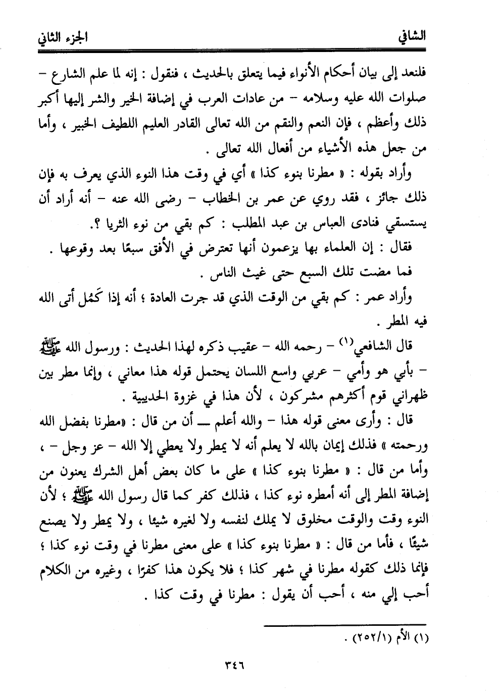 قال الشافعي (¬1) -رحمه الله- عقيب ذكره لهذا الحديث: ورسول الله - صلى الله عليه وسلم - -بأبي هو وأمي- عربي واسع اللسان يحتمل قوله هذا معاني، وإنما مطر بين ظهراني قوم أكثرهم مشركون, لأن هذا في غزوة الحديبية. قال: وأرى معنى قوله هذا -والله أعلم- أن من قال: "مطرنا بفضل الله ورحمته" فذلك إيمان بالله لا يعلم أنه لا يمطر ولا يعطي إلا الله -عز وجل-، وأما من قال: "مطرنا بنوء كذا" على ما كان بعض أهل الشرك يعنون من إضافة المطر إلى أنه أمطره نوء كذا، فذلك كفر كما قال رسول الله - صلى الله عليه وسلم -؛ لأن النوء وقت والوقت مخلوق لا يملك لنفسه ولا لغيره شيئاً، ولا يمطر ولا يصنع شيئًا، فأما من قال: "مطرنا بنوء كذا" على معنى مطرنا في وقت نوء كذا؛ فإنما ذلك كقوله مطرنا في شهر كذا؛ فلا يكون هذا كفرًا، وغيره من الكلام أحب إلى منه، أحب أن يقول: مطرنا في وقت كذا.