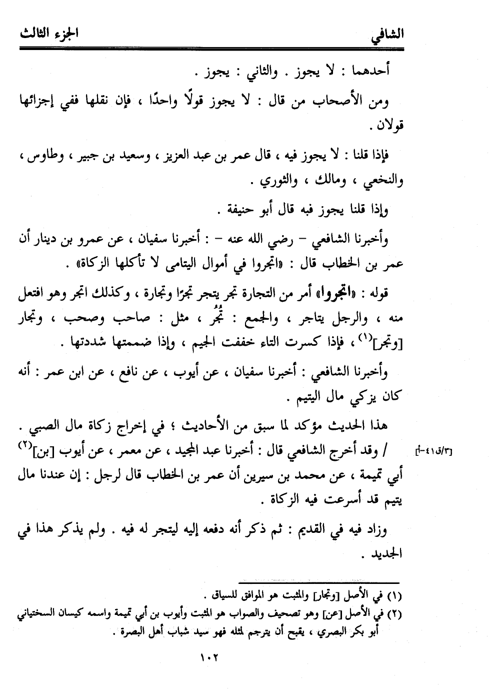 وأخبرنا الشافعي: أخبرنا سفيان، عن أيوب، عن نافع، عن ابن عمر: أنه كان يزكي مال اليتيم.