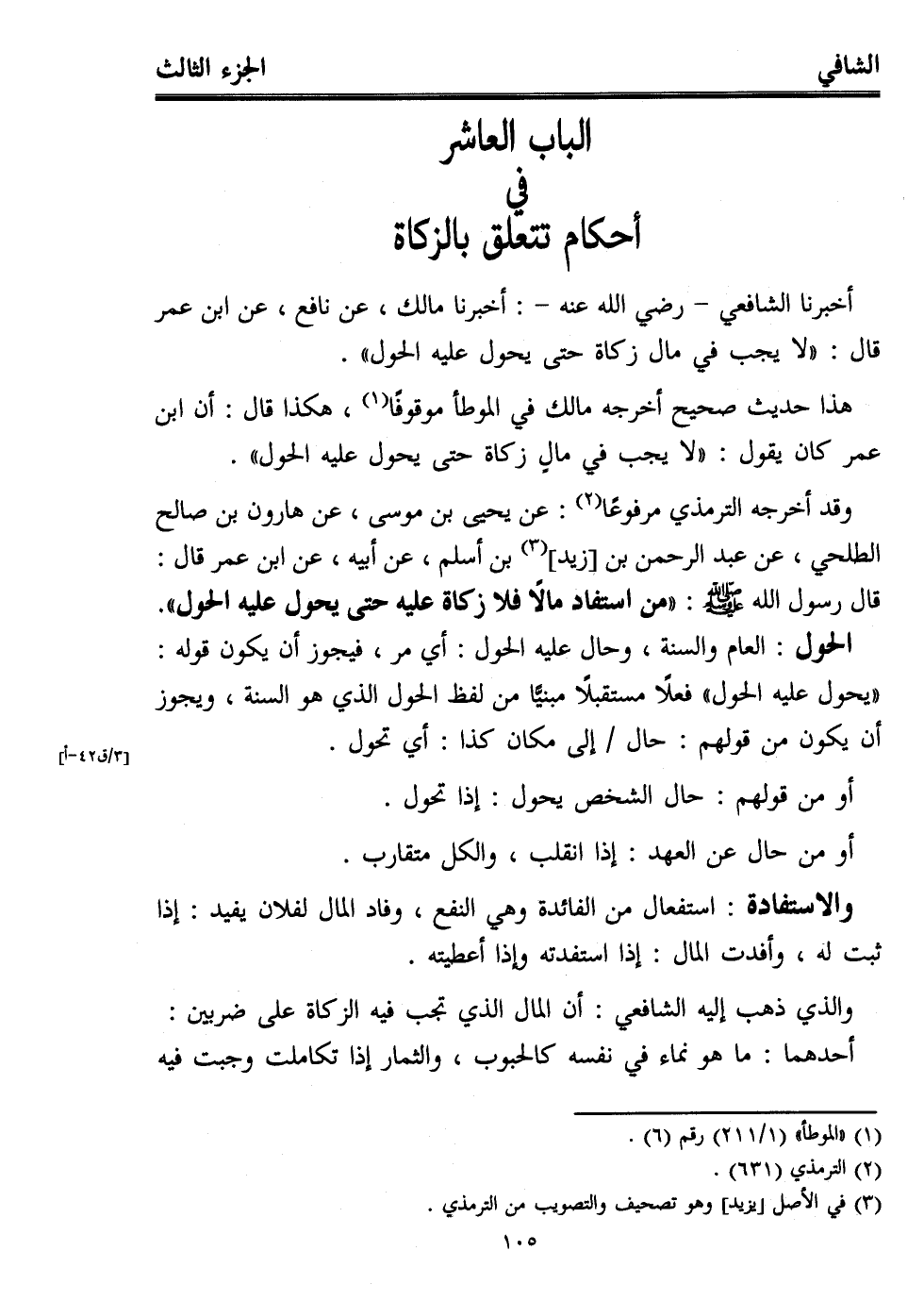 أخبرنا الشافعي -رضي الله عنه-: أخبرنا مالك، عن نافع، عن ابن عمر قال: "لا يجب في مال زكاة حتى يحول عليه الحول".