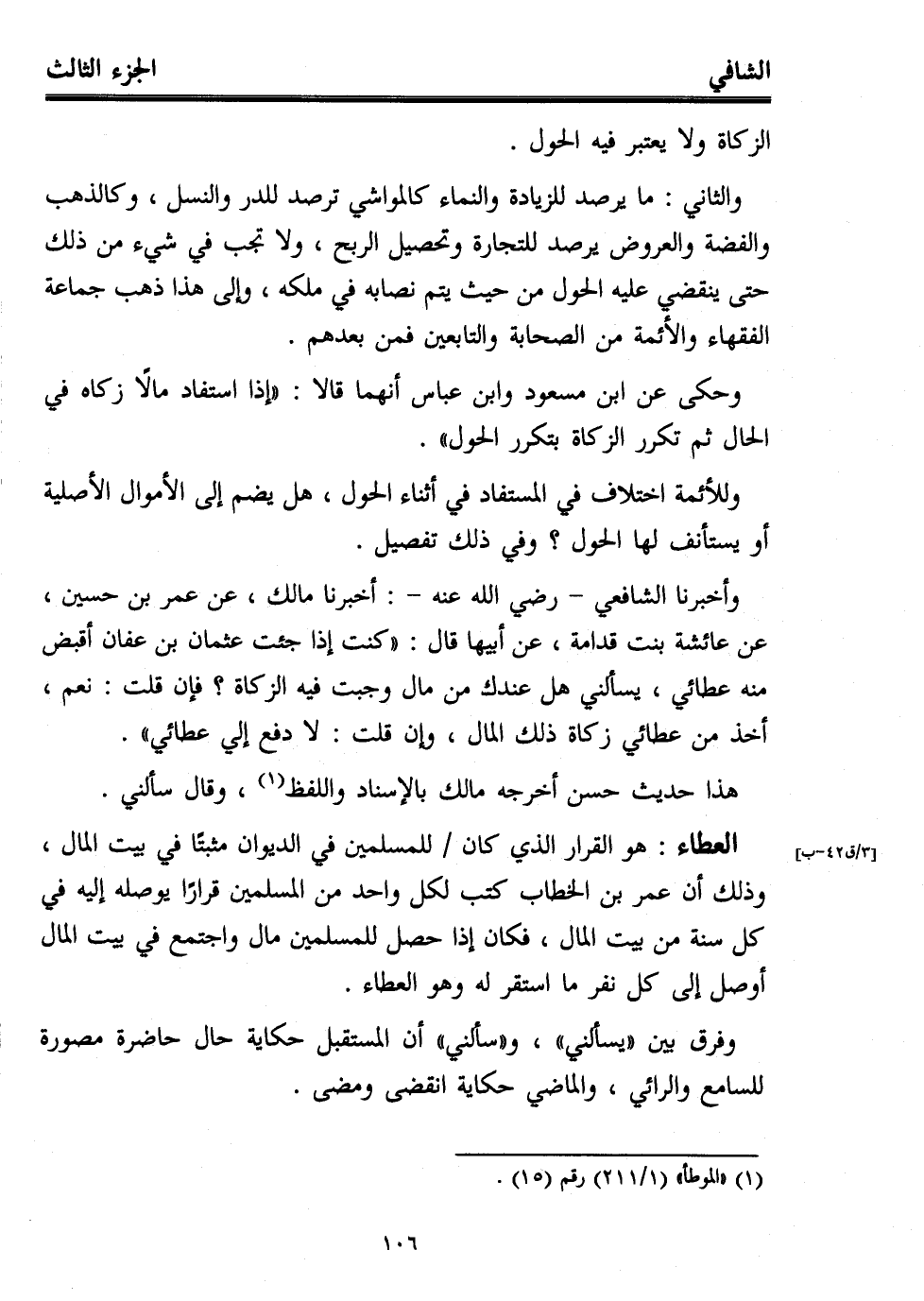 وأخبرنا الشافعي -رضي الله عنه-: أخبرنا مالك، عن عمر بن حسين، عن عائشة بنت قدامة، عن أبيها قال: "كنت إذا جئت عثمان بن عفان أقبض منه عطائي، يسألني هل عندك من مال وجبت فيه الزكاة؟ فإن قلت: نعم، أخذ من عطائي زكاة ذلك المال، وإن قلت: لا دفع إلي عطائي".
