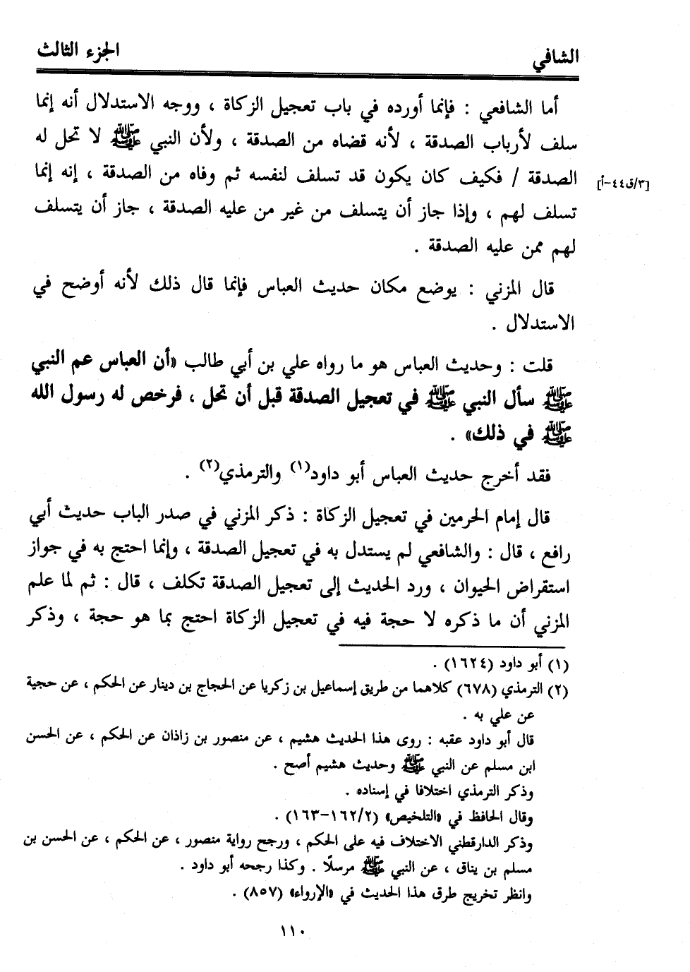 قلت: وحديث العباس هو ما رواه علي بن أبي طالب "أن العباس عم النبي سأل النبي - صلى الله عليه وسلم - في تعجيل الصدقة قبل أن تحل، فرخص له رسول الله - صلى الله عليه وسلم - في ذلك".