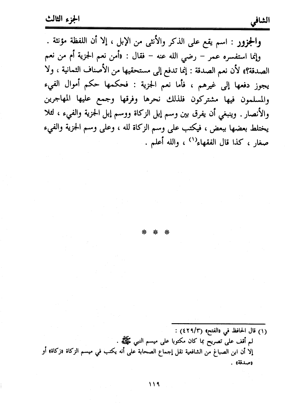 وإنما استفسره عمر -رضي الله عنه- فقال: "أمن نعم الجزية أم من نعم الصدقة؟ " لأن نعم الصدقة: إنما تدفع إلى مستحقيها من الأصناف الثمانية، ولا يجوز دفعها إلى غيرهم، فأما نعم الجزية: فحكمها حكم أموال الفيء والمسلمون فيها مشتركون فلذلك نحرها وفرقها وجمع عليها المهاجرين