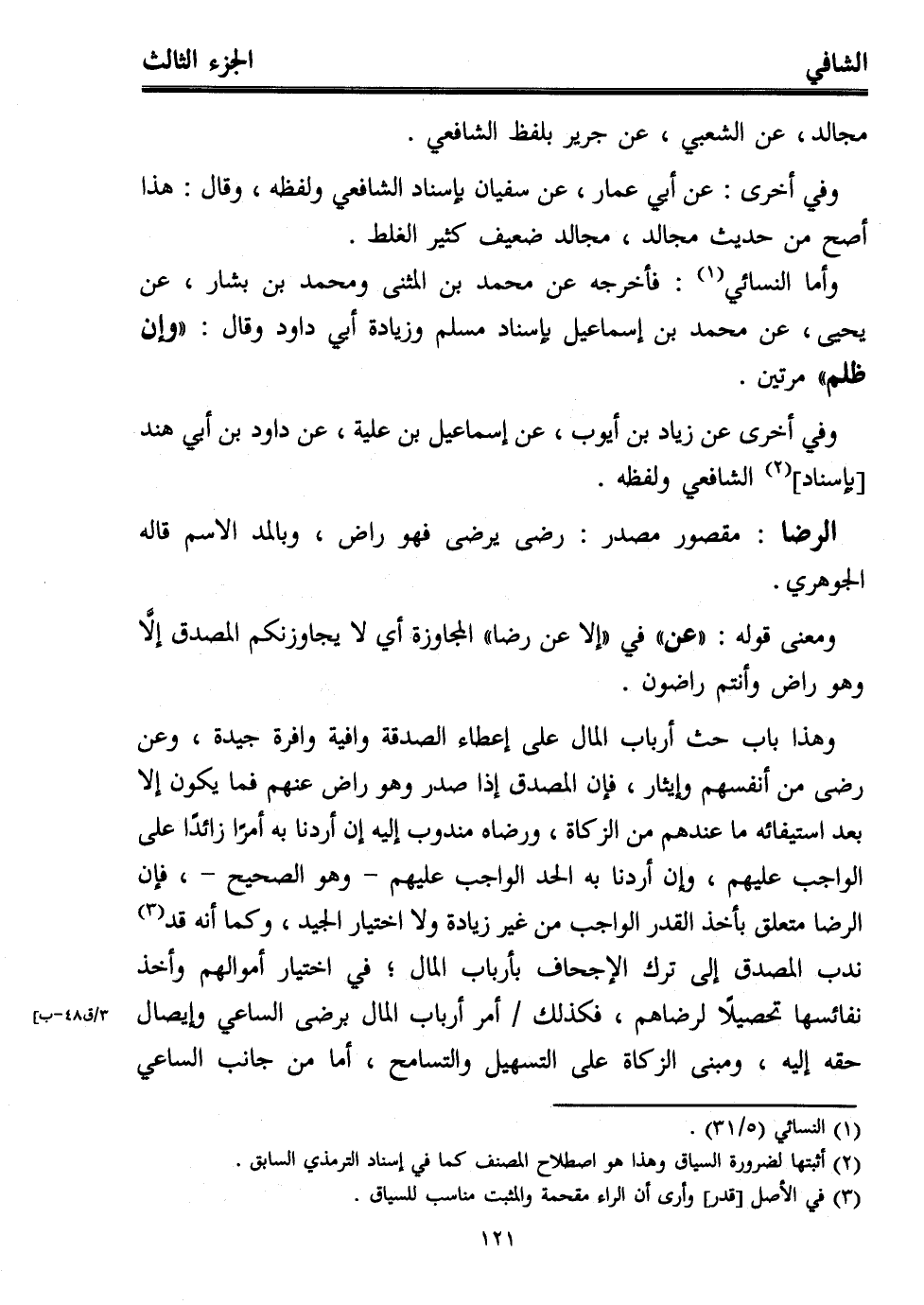 وفي أخرى: عن أبي عمار، عن سفيان بإسناد الشافعي ولفظه، وقال: هذا أصح من حديث مجالد، مجالد ضعيف كثير الغلط.