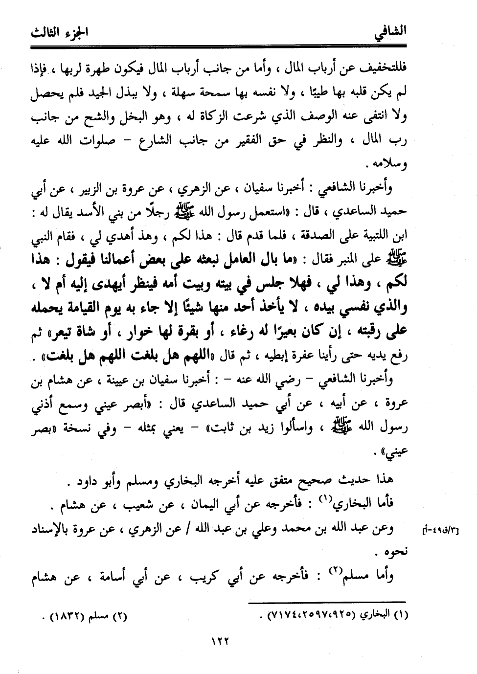 وأخبرنا الشافعي: أخبرنا سفيان، عن الزهري، عن عروة بن الزبير عن أبي حميد الساعدي، قال: "استعمل رسول الله - صلى الله عليه وسلم - رجلاً من بني الأسد يقال له: ابن اللتبية على الصدقة، فلما قدم قال هذا لكم، وهذ أهدي لي، فقام النبي - صلى الله عليه وسلم - على المنبر فقال: "ما بال العامل نبعثه على بعض أعمالنا فيقول: هذا لكم، وهذا لي، فهلا جلس في بيته وبيت أمه فينظر أيهدى إليه أم لا، والذي نفسي بيده، لا يأخذ أحد منها شيئًا إلا جاء به يوم القيامة يحمله على رقبته، إن كان بعيرًا له رغاء، أو بقرة لها خوار، أو شاة تيعر" ثم رفع يديه حتى رأينا عفرة إبطيه، ثم قال "اللهم هل بلغت اللهم هل بلغت".