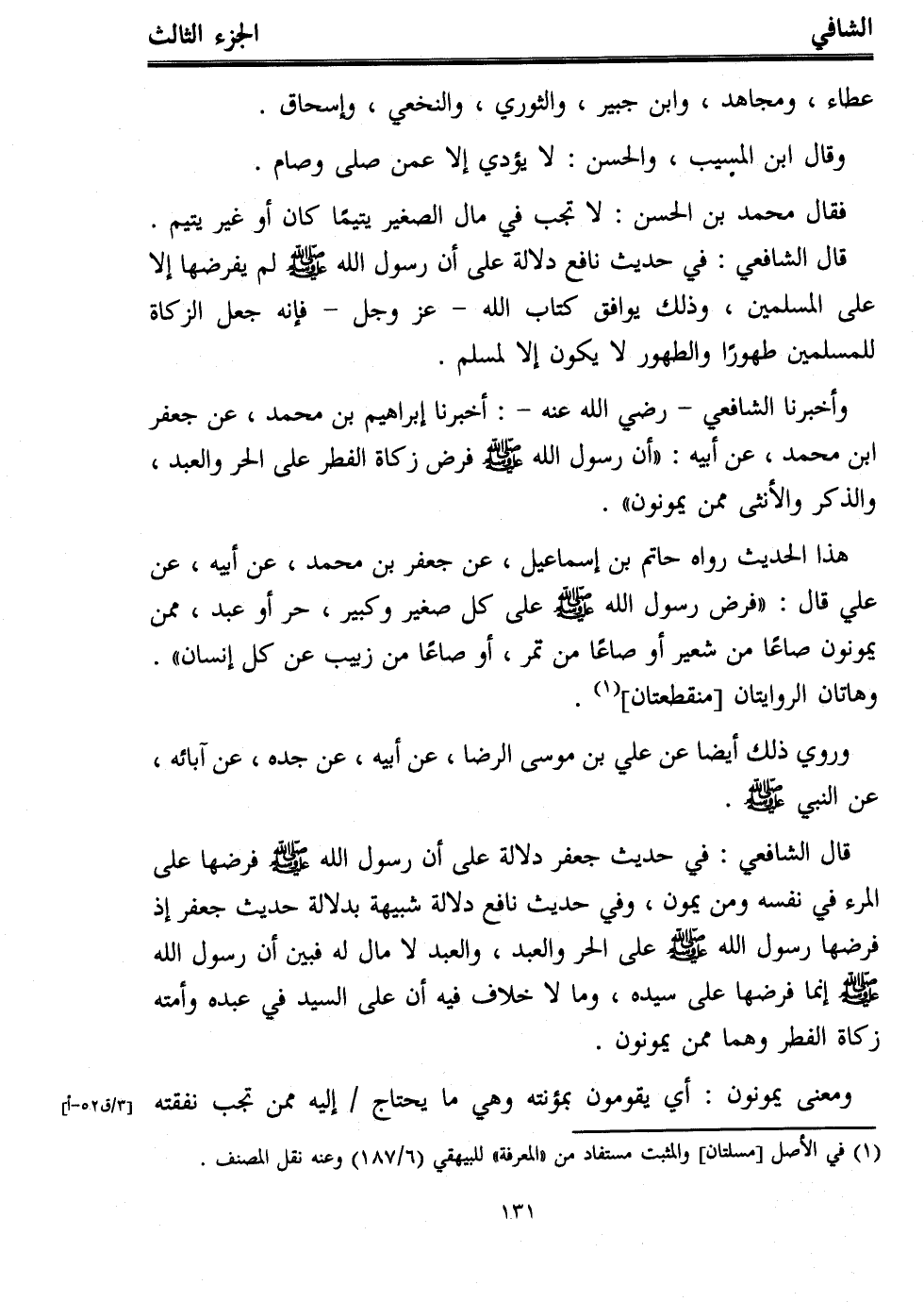 وأخبرنا الشافعي -رضي الله عنه-: أخبرنا إبراهيم بن محمد، عن جعفر ابن محمد، عن أبيه: "أن رسول الله - صلى الله عليه وسلم - فرض زكاة الفطر على الحر والعبد، والذكر والأنثى ممن يمونون".
