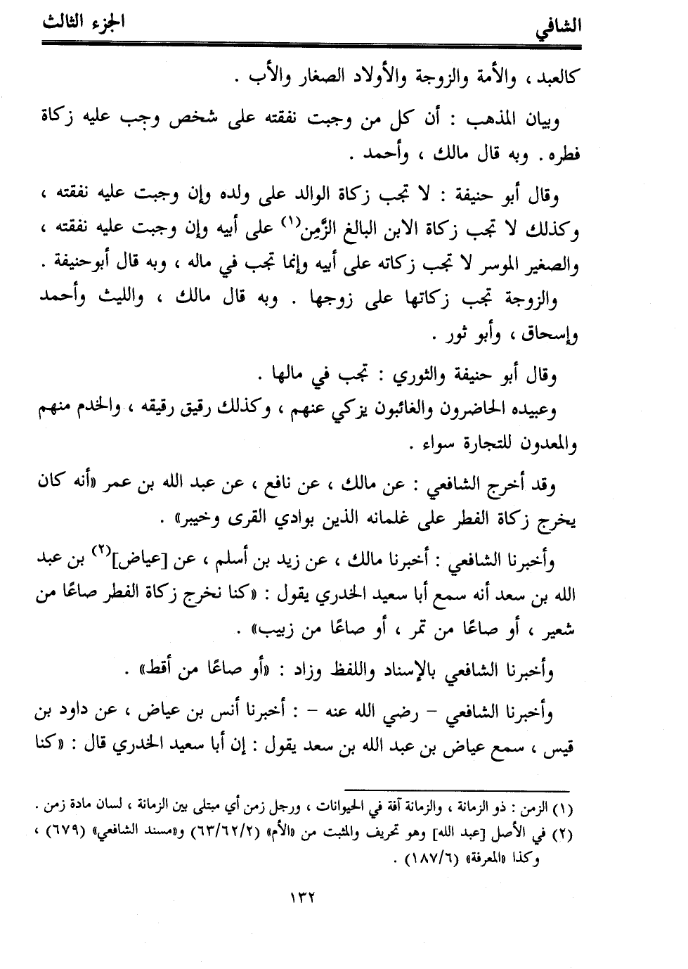 وقال أبو حنيفة: لا تجب زكاة الوالد على ولده وإن وجبت عليه نفقته، وكذلك لا تجب زكاة الابن البالغ الزَّمِن (¬1) على أبيه وإن وجبت عليه نفقته، والصغير الموسر لا تجب زكاته على أبيه وإنما تجب في ماله، وبه قال أبو حنيفة.
