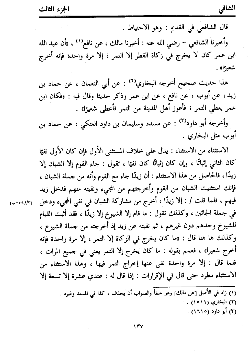 الاستثناء من الاستثناء: يدل على خلاف المستثنى الأول فإن كان الأول نفيًا كان الثاني إثباتًا، وإن كان إثباتًا كان نفيًا، تقول: جاء القوم إلا الشبان إلا زيدًا، فالحاصل من هذا الاستثناء: أن زيدًا جاء مع القوم وأنه من جملة الشبان، فإنك استثنيت الشبان من القوم وأخرجتهم من المجيء ونفيته منهم فدخل زيد فيهم، فلما قلت: إلا زيدًا، أخرج من مشاركة الشبان في نفي المجيء ودخل في جملة الجائين، وكذلك تقول: ما قام إلا الشيوخ إلا زيدًا، فقد أثبت القيام للشيوخ وحدهم دون غيرهم، ثم نفيته عن زيد إذ أخرجته من جملة الشيوخ، وكذلك هاهنا قال: "ما كان يخرج في الزكاة إلا التمر، إلا مرة واحدة فإنه أخرج شعيرا"، فعمم بقوله: ما كان يخرج إلا التمر يعني في جميع المرات، فلما قال: إلا مرة واحدة نفى عنها إخراج التمر فيها، وهذا الاستثناء من الاستثناء مطرد حتى قال في الإقرارات: إذا قال له: عندي عشرة إلا تسعة إلا