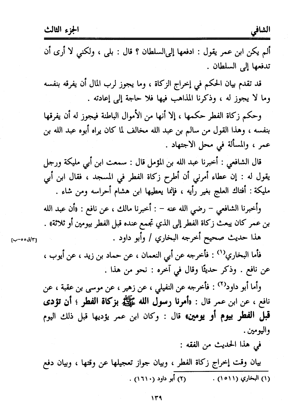 وأما أبو داود (¬2): فأخرجه عن النفيلي، عن زهير، عن موسى بن عقبة، عن نافع، عن ابن عمر قال: "أمرنا رسول الله - صلى الله عليه وسلم - بزكاة الفطر؛ أن تؤدى قبل الفطر بيوم أو يومين" قال: وكان ابن عمر يؤديها قبل ذلك اليوم واليومين.