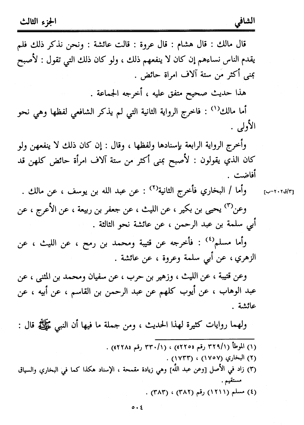 قال مالك: قال هشام: قال عروة: قالت عائشة: ونحن نذكر ذلك فلم يقدم الناس نساءهم إن كان لا ينفعهم ذلك، ولو كان ذلك التي تقول: لأصبح بمنى أكثر من ستة آلاف امراة حائض.