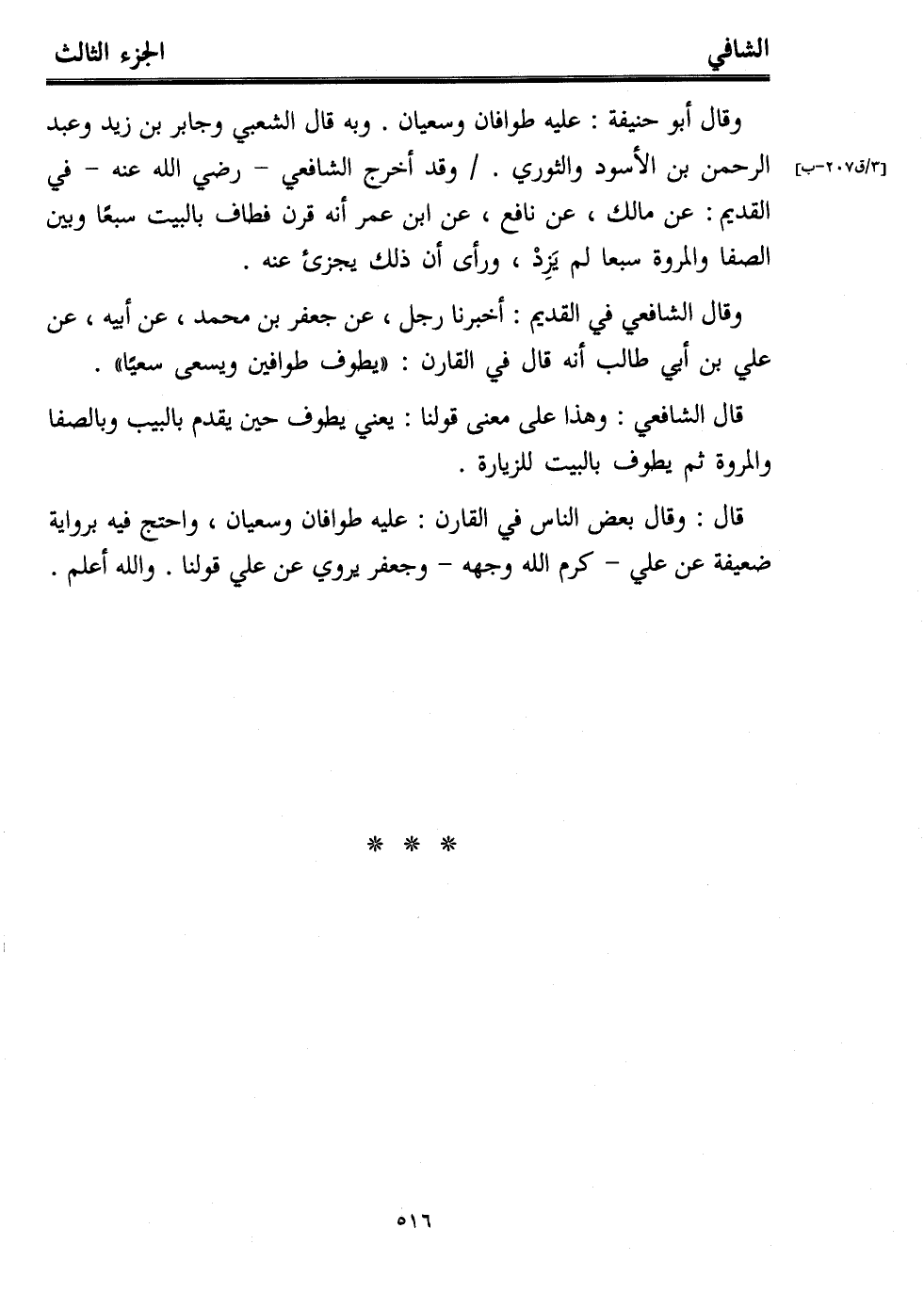 وقال الشافعي في القديم: أخبرنا رجل، عن جعفر بن محمد، عن أبيه، عن علي بن أبي طالب أنه قال في القارن: "يطوف طوافين ويسعى سعيًا".
