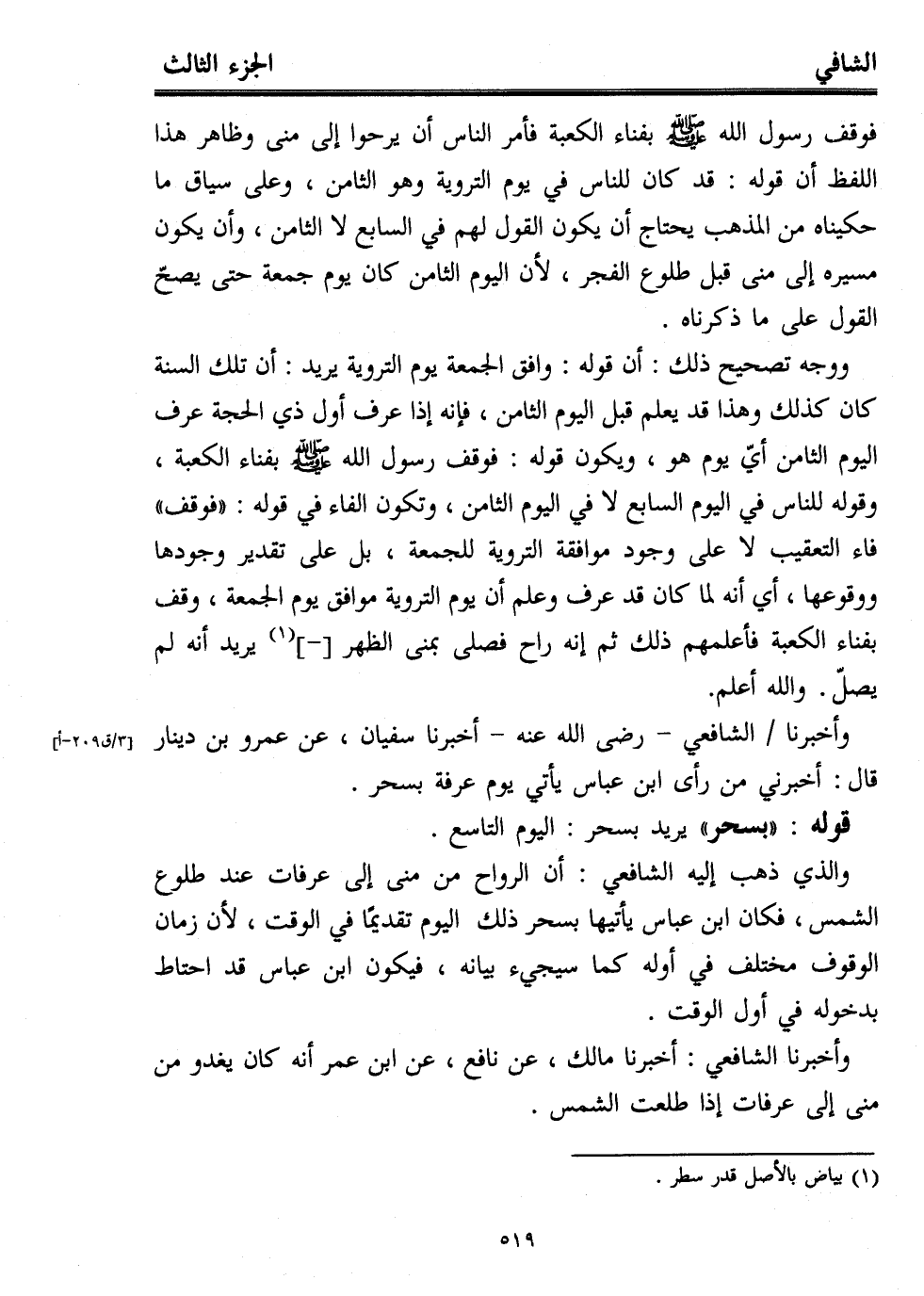 وأخبرنا الشافعي: أخبرنا مالك، عن نافع، عن ابن عمر أنه كان يغدو من منى إلى عرفات إذا طلعت الشمس.