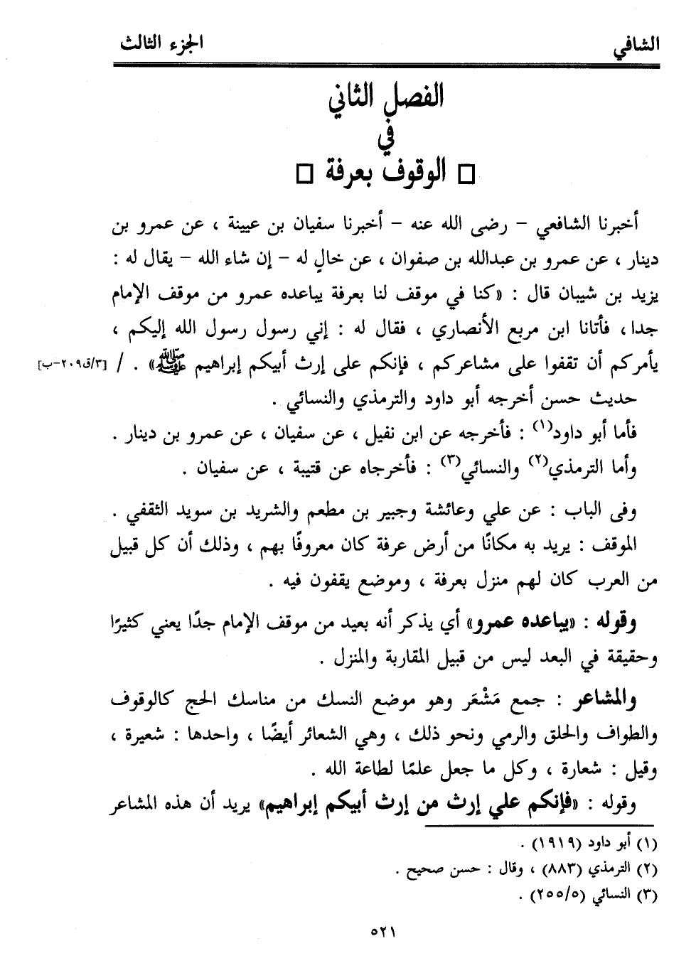 أخبرنا الشافعي -رضي الله عنه- أخبرنا سفيان بن عيينة، عن عمرو بن دينار، عن عمرو بن عبد الله بن صفوان، عن خالٍ له -إن شاء الله- يقال له: يزيد بن شيبان قال: "كنا في موقف لنا بعرفة يباعده عمرو من موقف الإِمام جدا، فأتانا ابن مربع الأنصاري، فقال له: إني رسول رسول الله إليكم، يأمركم أن تقفوا على مشاعركم، فإنكم على إرث أبيكم إبراهيم - صلى الله عليه وسلم -".