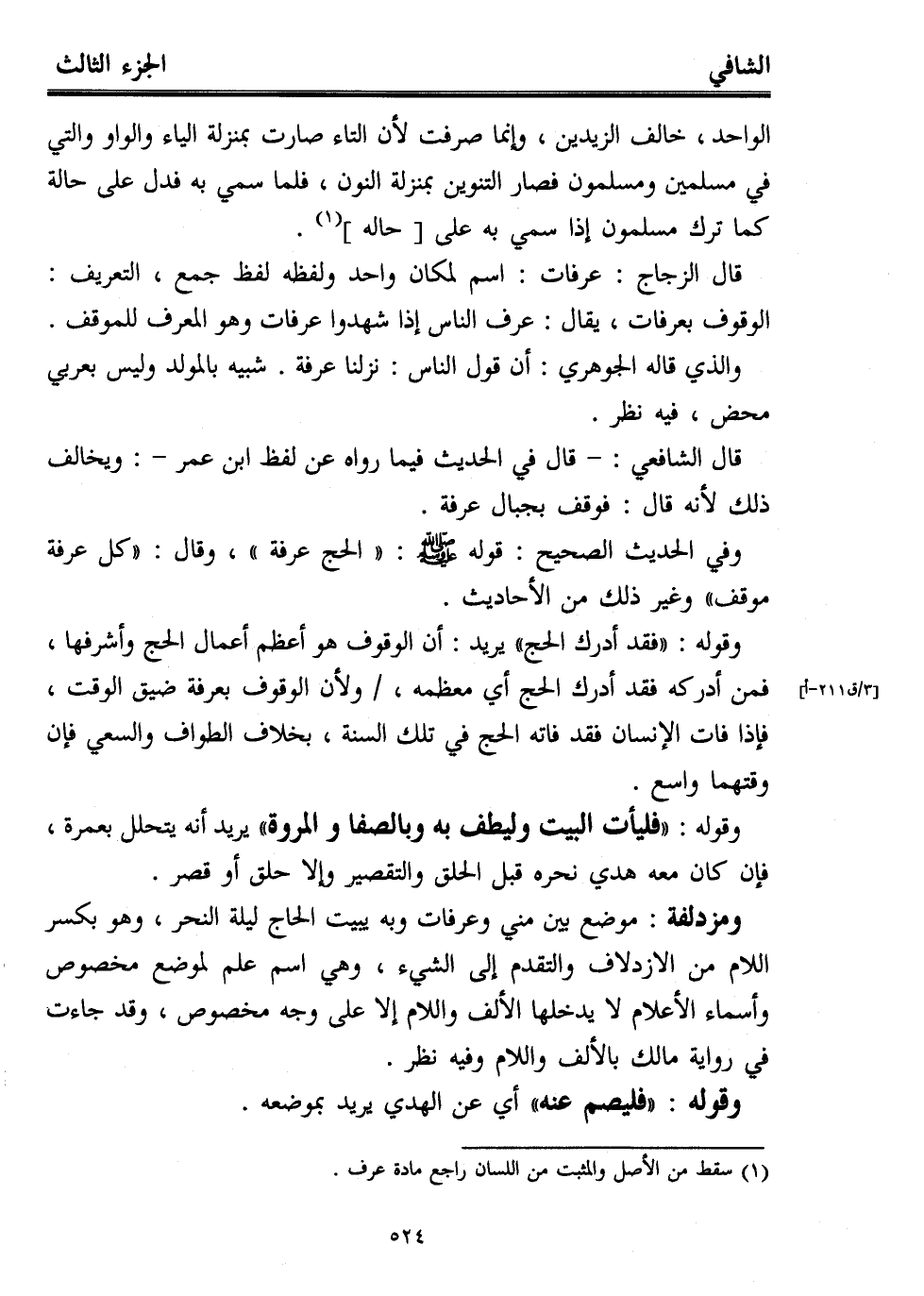 وفي الحديث الصحيح: قوله - صلى الله عليه وسلم -: "الحج عرفة"، وقال: "كل عرفة موقف" وغير ذلك من الأحاديث.