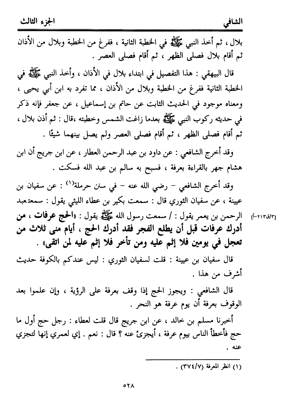 وقد أخرج الشافعي -رضي الله عنه- في سنن حرملة (¬1): عن سفيان بن عيينة، عن سفيان الثوري قال: سمعت بكير بن عطاء الليثي يقول: سمعت عبد الرحمن بن يعمر يقول: سمعت رسول الله - صلى الله عليه وسلم - يقول: "الحج عرفات، من أدرك عرفات قبل أن يطلع الفجر فقد أدرك الحج، أيام منى ثلاث من تعجل في يومين فلا إثم عليه ومن تأخر فلا إثم عليه لمن اتقى".