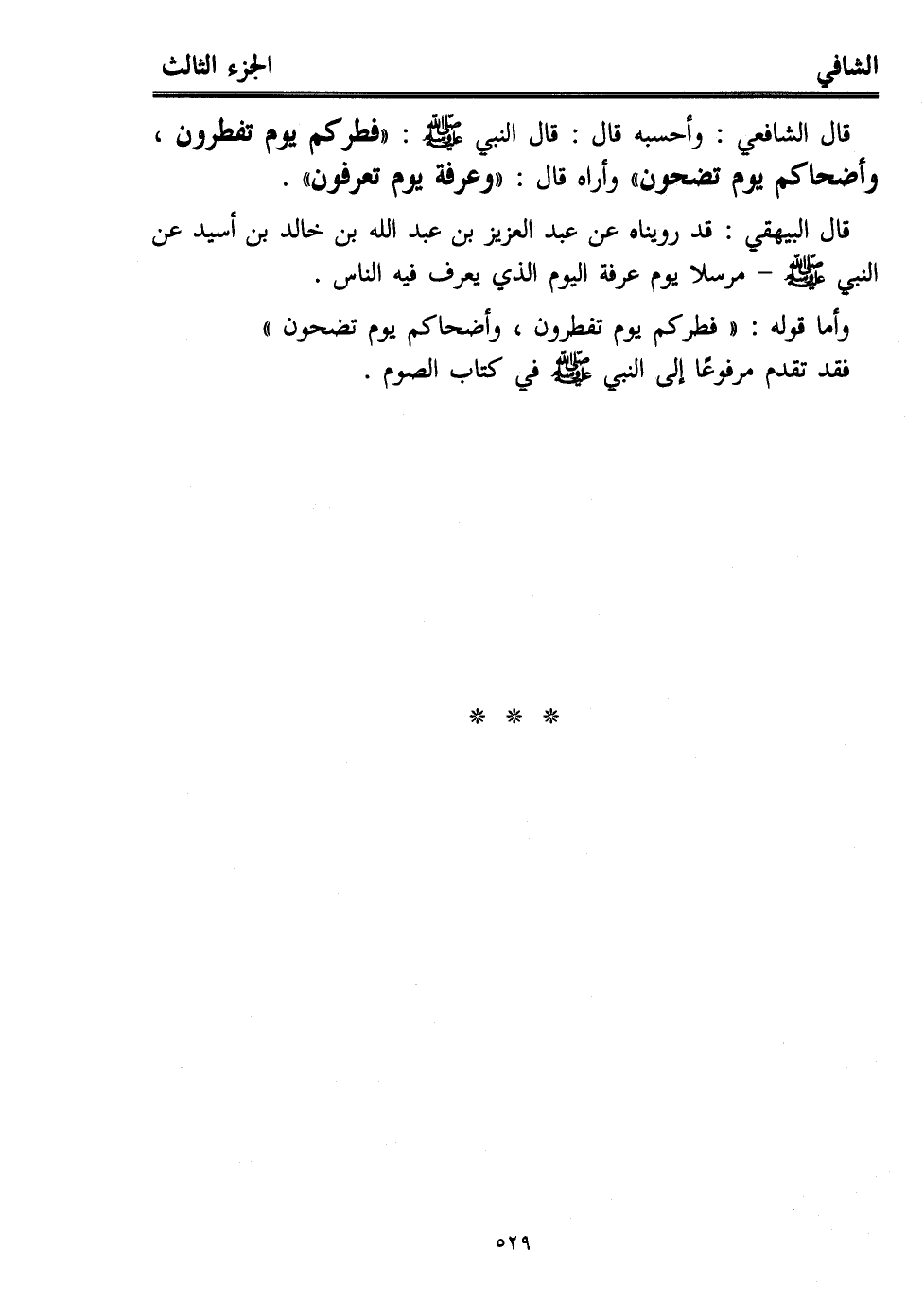 قال الشافعي: وأحسبه قال: قال النبي - صلى الله عليه وسلم -: "فطركم يوم تفطرون، وأضحاكم يوم تضحون" وأراه قال: "وعرفة يوم تعرفون".