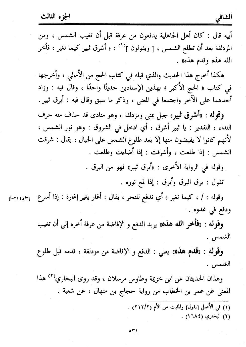 وقوله: "أشرق ثبير" جبل بمنى ومزدلفة، وهو منادى قد حذف منه حرف النداء، التقدير: يا ثبير أشرق، أي ادخل في الشروق: وهو نور الشمس، لأنهم كانوا لا يفيضون منها إلا بعد طلوع الشمس على الجبال، يقال: شرقت الشمس: إذا طلعت، وأشرقت: إذا أضاءت وطلعت.