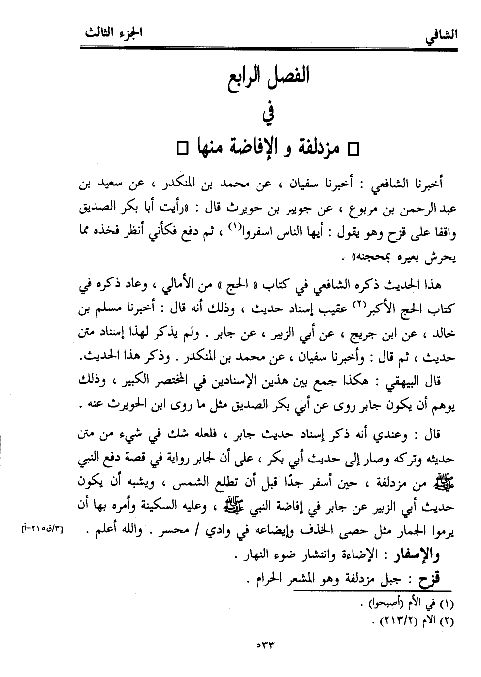 أخبرنا الشافعي: أخبرنا سفيان، عن محمد بن المنكدر، عن سعيد بن عبد الرحمن بن مربوع، عن جويبر بن حويرث قال: "رأيت أبا بكر الصديق واقفا على قزح وهو يقول: أيها الناس اسفروا (¬1)، ثم دفع فكأني انظر فخذه مما يحرش بعيره بمحجنه".