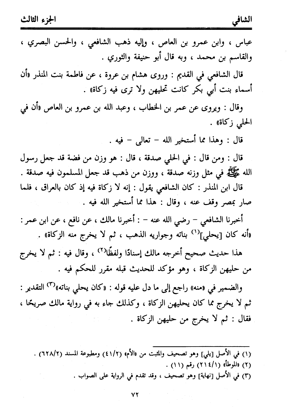 قال الشافعي في القديم: وروى هشام بن عروة، عن فاطمة بنت المنذر "أن أسماء بنت أبي بكر كانت تحليهن ولا ترى فيه زكاة".