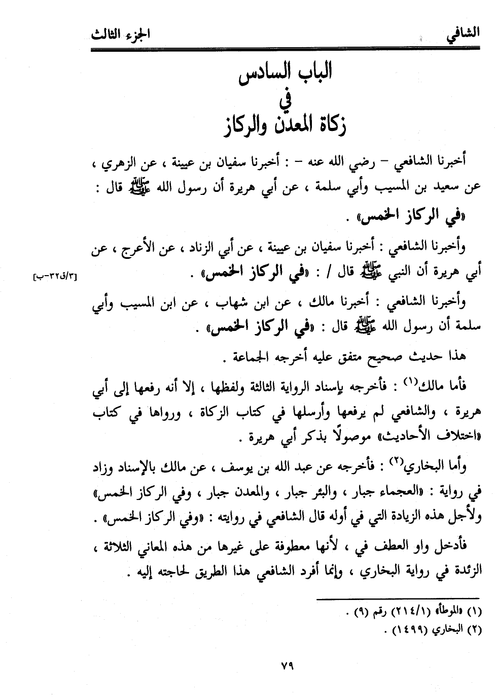 أخبرنا الشافعي -رضي الله عنه-: أخبرنا سفيان بن عيينة، عن الزهري، عن سعيد بن المسيب وأبي سلمة، عن أبي هريرة أن رسول الله - صلى الله عليه وسلم - قال: "في الركاز الخمس".