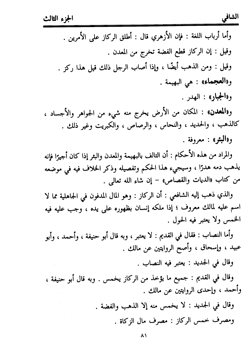 والذي ذهب إليه الشافعي: أن الركاز: وهو المال المدفون في الجاهلية مما لا اسم عليه لمالك معروف؛ إذا ملكه إنسان بظهوره على يده، وجب عليه فيه الخمس ولا يعتبر فيه الحول.