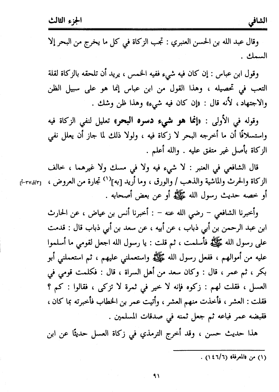 قال الشافعي في العنبر: لا شيء فيه ولا في مسك ولا غيرهما، خالف الزكاة والحرث والماشية والذهب والورق، وما أريد [به] (¬1) تجارة من العروض، أو خصه حديث رسول الله - صلى الله عليه وسلم - أو عن بعض أصحابه. وأخبرنا الشافعي -رضي الله عنه-: أخبرنا أنس بن عياض، عن الحارث ابن عبد الرحمن بن أبي ذباب، عن أبيه، عن سعد بن أبي ذباب قال: قدمت على رسول الله - صلى الله عليه وسلم - فأسلمت، ثم قلت: يا رسول الله اجعل لقومي ما أسلموا عليه من أموالهم، ففعل رسول الله - صلى الله عليه وسلم - واستعملني عليهم، ثم استعملني أبو بكر، ثم عمر، قال: وكان سعد من أهل السراة، قال: فكلمت قومي في العسل، فقلت لهم: زكوه فإنه لا خير في ثمرة لاتزكى، فقالوا: كم؟ فقلت: العشر، فأخذت منهم العشر، وأتيت عمر بن الخطاب فأخبرته بما كان، فقبضه عمر فباعه ثم جعل ثمنه في صدقات المسلمين.