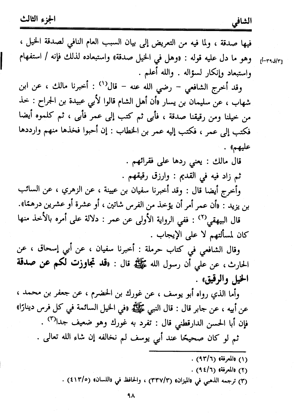 وأخرج أيضًا قال: وقد أخبرنا سفيان بن عيينة، عن الزهري، عن السائب بن يزيد: "أن عمر أمر أن يؤخذ من الفرس شاتين، أو عشرة أو عشرين درهمًا".