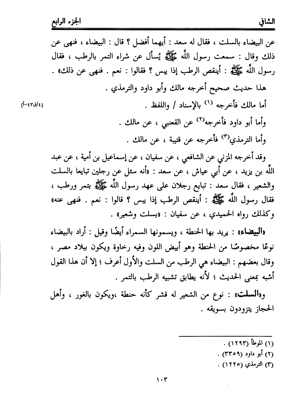 عن البيضاء بالسلت، فقال له سعد: أيهما أفضل؟ قال: البيضاء، فنهى عن ذلك وقال: سمعت رسول الله - صلى الله عليه وسلم - يُسأل عن شراء التمر بالرطب، فقال رسول الله - صلى الله عليه وسلم -: أينقص الرطب إذا يبس؟ فقالوا: نعم. فنهى عن ذلك".