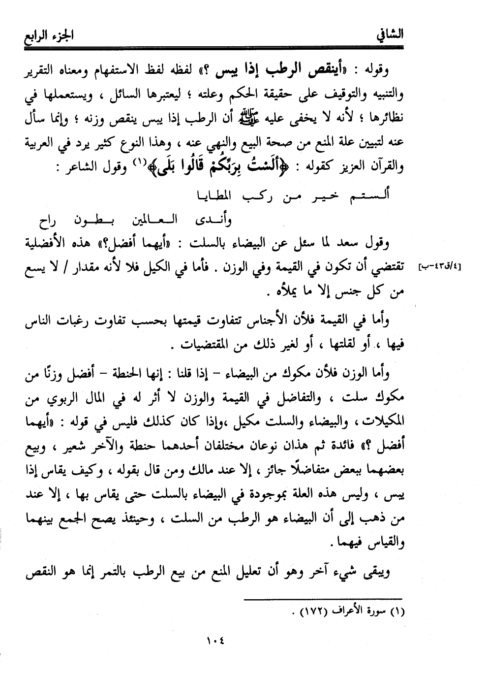 وقوله: "أينقص الرطب إذا يبس؟ " لفظه لفظ الاستفهام ومعناه التقرير والتنبيه والتوقيف على حقيقة الحكم وعلته؛ ليعتبرها السائل، ويستعملها في نظائرها؛ لأنه لا يخفى عليه - صلى الله عليه وسلم - أن الرطب إذا يبس ينقص وزنه؛ وإنما سأل عنه لتبيين علة المنع من صحة البيع والنهي عنه، وهذا النوع كثير يرد في العربية والقرآن العزيز كقوله: {أَلَسْتُ بِرَبِّكُمْ قَالُوا بَلَى} (¬1) وقول الشاعر: