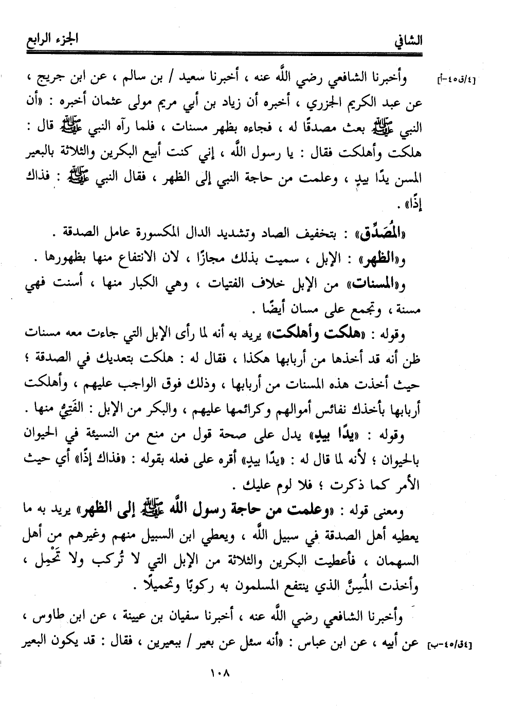 وأخبرنا الشافعي -رضي الله عنه-، أخبرنا سعيد بن سالم، عن ابن جريج، عن عبد الكريم الجزري، أخبره أن زياد بن أبي مريم مولى عثمان أخبره: "أن النبي - صلى الله عليه وسلم - بعث مصدقًا له، فجاءه بظهر مسنات، فلما رآه النبي - صلى الله عليه وسلم - قال: هلكت وأهلكت فقال: يا رسول الله، إني كنت أبيع البكرين والثلاثة بالبعير المسن يدًا بيدٍ، وعلمت من حاجة النبي إلى الظهر، فقال النبي - صلى الله عليه وسلم -: فذاك إذًا".