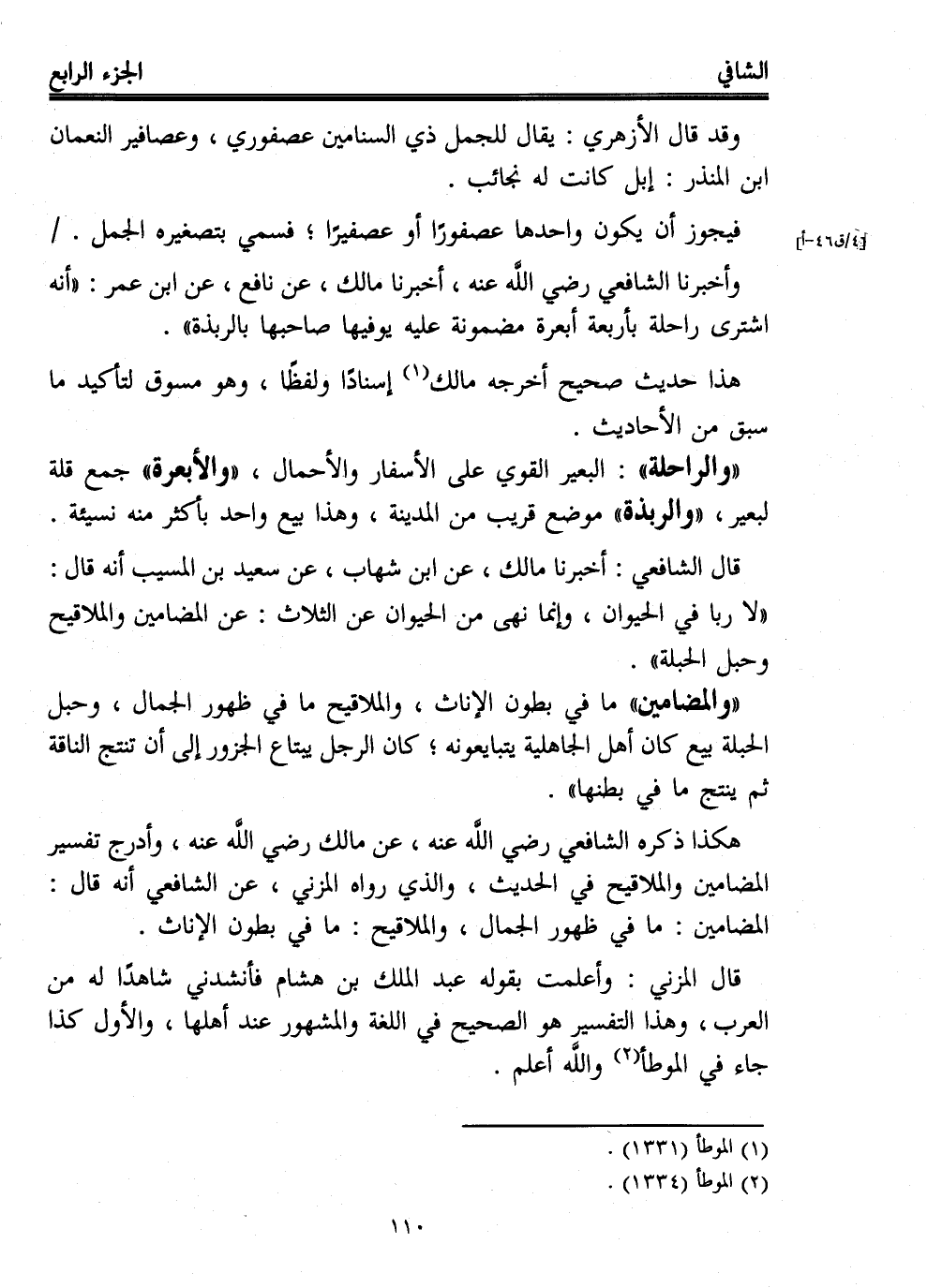 قال المزني: وأعلمت بقوله عبد الملك بن هشام فأنشدني شاهدًا له من العرب، وهذا التفسير هو الصحيح في اللغة والمشهور عند أهلها، والأول كذا جاء في الموطأ (¬2) والله أعلم.