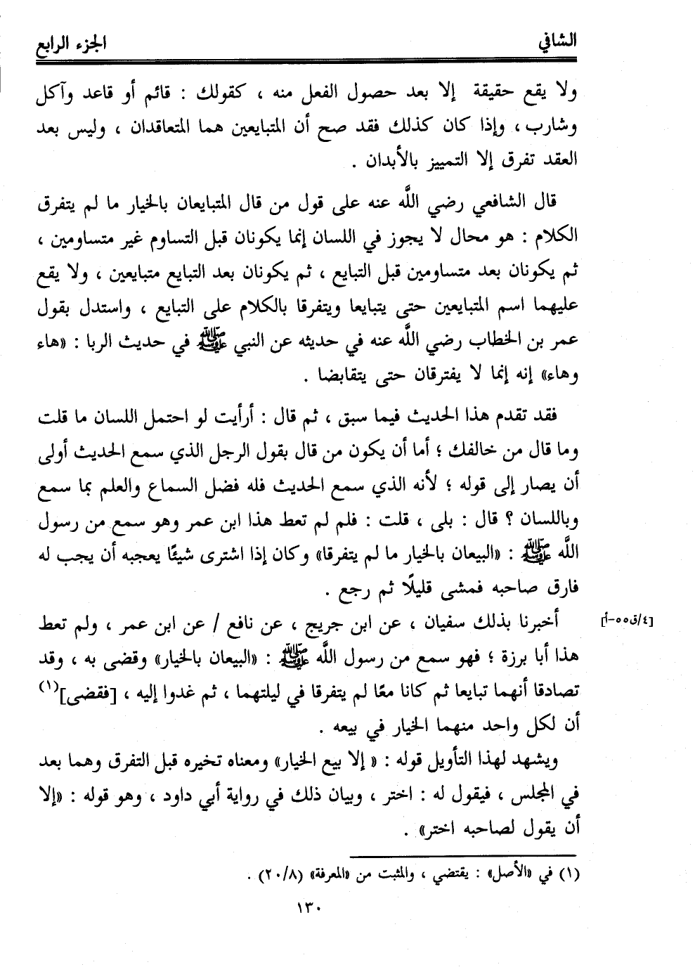 قال الشافعي -رضي الله عنه- على قول من قال المتبايعان بالخيار ما لم يتفرق الكلام: هو محال لا يجوز في اللسان إنما يكونان قبل التساوم غير متساومين، ثم يكونان بعد متساومين قبل التبايع، ثم يكونان بعد التبايع متبايعين، ولا يقع عليهما اسم المتبايعين حتى يتبايعا ويتفرقا بالكلام على التبايع، واستدل بقول عمر بن الخطاب -رضي الله عنه- في حديثه عن النبي - صلى الله عليه وسلم - في حديث الربا: "هاء وهاء" إنه إنما لا يفترقان حتى يتقابضا.