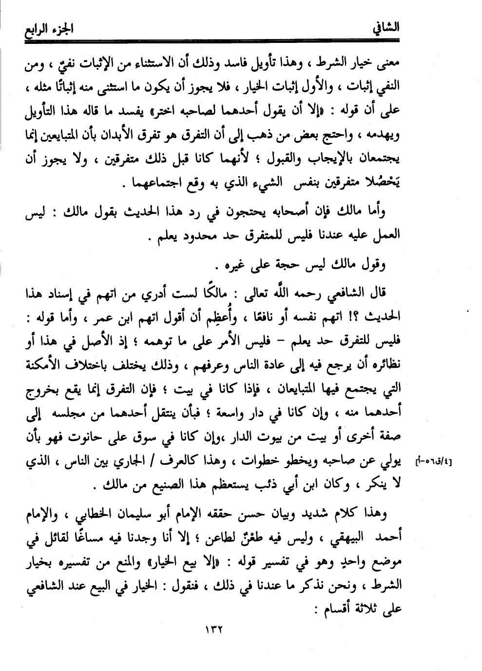 قال الشافعي -رحمه الله تعالى-: مالكًا لست أدري من اتهم في إسناد هذا الحديث؟! اتهم نفسه أو نافعًا، وأُعظِم أن أقول اتهم ابن عمر، وأما قوله: فليس للتفرق حد يعلم -فليس الأمر على ما توهمه؛ إذ الأصل في هذا أو نظائره أن يرجع فيه إلى عادة الناس وعرفهم، وذلك يختلف باختلاف الأمكنة التي يجتمع فيها المتبايعان، فإذا كانا في بيت؛ فإن التفرق إنما يقع بخروج أحدهما منه، وإن كانا في دار واسعة؛ فبأن ينتقل أحدهما من مجلسه إلى صفة أخرى أو بيت من بيوت الدار، وإن كانا في سوق على حانوت فهو بأن يولي عن صاحبه ويخطو خطوات، وهذا كالعرف الجاري بين الناس، الذي لا ينكر، وكان ابن أبي ذئب يستعظم هذا الصنيع من مالك.