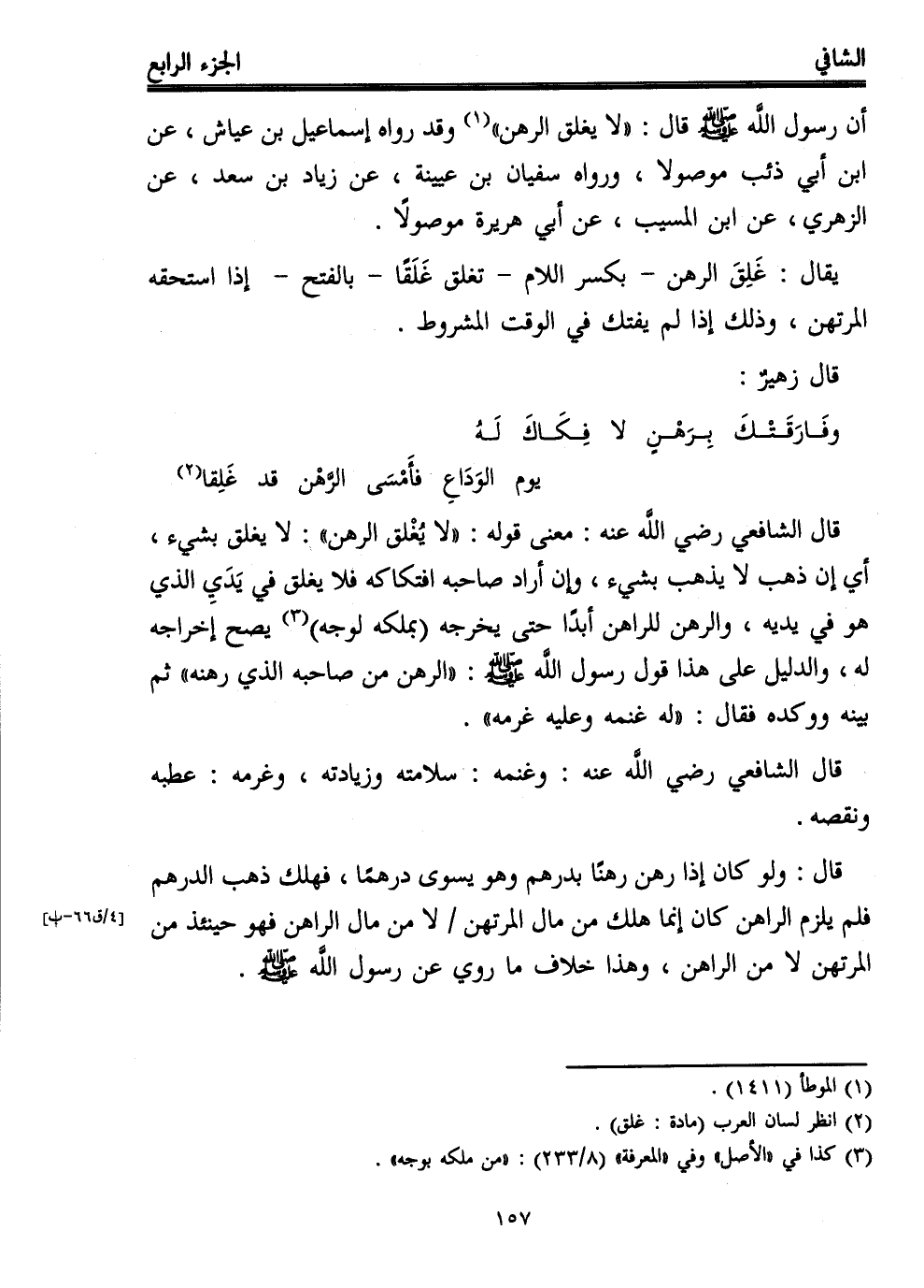 قال الشافعي -رضي الله عنه-: معنى قوله: "لا يُغْلق الرهن": لا يغلق بشيء، أي إن ذهب لا يذهب بشيء، وإن أراد صاحبه افتكاكه فلا يغلق في يَدَيِ الذي هو في يديه، والرهن للراهن أبدًا حتى يخرجه (بملكه لوجه) (¬3) يصح إخراجه له، والدليل على هذا قول رسول الله - صلى الله عليه وسلم -: "الرهن من صاحبه الذي رهنه" ثم بينه ووكده فقال: "له غنمه وعليه غرمه".