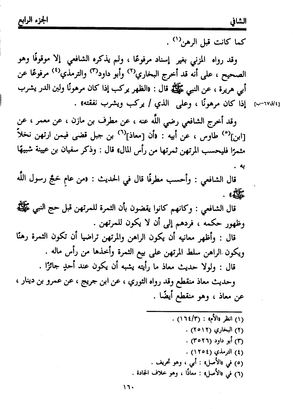 وقد أخرج الشافعي -رضي الله عنه-، عن مطرف بن مازن، عن معمر، عن [ابن] (¬5) طاوس، عن أبيه: "أن [معاذ] (¬6) بن جبل قضى فيمن ارتهن نخلاً مثمرًا فليحسب المرتهن ثمرتها من رأس المال" قال: وذكر سفيان بن عيينة شبيهًا به.