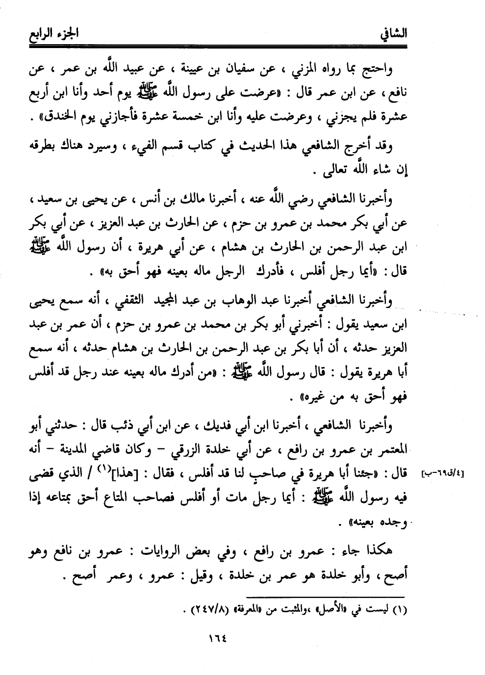 وأخبرنا الشافعي أخبرنا عبد الوهاب بن عبد المجيد الثقفي، أنه سمع يحيى ابن سعيد يقول: أخبرني أبو بكر بن محمد بن عمرو بن حزم، أن عمر بن عبد العزيز حدثه، أن أبا بكر بن عبد الرحمن بن الحارث بن هشام حدثه، أنه سمع أبا هريرة يقول: قال رسول الله - صلى الله عليه وسلم -: "من أدرك ماله بعينه عند رجل قد أفلس فهو أحق به من غيره".