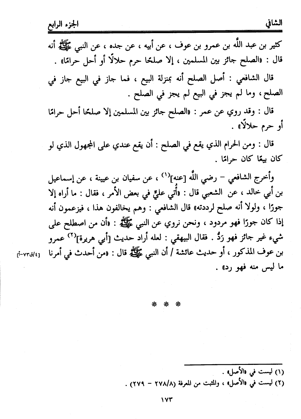 وأخرج الشافعي -رضي الله [عنه]- (¬1)، عن سفيان بن عيينة، عن إسماعيل بن أبي خالد، عن الشعبي قال: "أُتي عليٌّ في بعض الأمر، فقال: ما أراه إلا جورًا, ولولا أنه صلح لرددته" قال الشافعي: وهم يخالفون هذا، فيزعمون أنه إذا كان جورًا فهو مردود، ونحن نروي عن النبي - صلى الله عليه وسلم -: "أن من اصطلح على شيء غير جائز فهو رَدُّ. فقال البيهقي: لعله أراد حديث [أبي هريرة] (¬2) عمرو بن عوف المذكور، أو حديث عائشة أن النبي - صلى الله عليه وسلم - قال: "من أحدث في أمرنا ما ليس منه فهو رد".