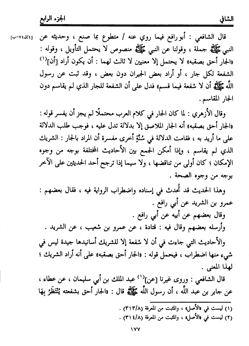 قال الشافعي: أبو رافع فيما روي عنه متطوع بما صنع، وحديثه عن النبي - صلى الله عليه وسلم - جملة، وقولنا عن النبي - صلى الله عليه وسلم - منصوص لا يحتمل التأويل، وقوله: "الجار أحق بصقبه" لا يحتمل إلا معتيين لا ثالث لهما: أن يكون أراد [أن] (¬1) الشفعة لكل جار، أو أراد بعض الجيران دون بعض، وقد ثبت عن رسول الله - صلى الله عليه وسلم - " أن لا شفعة فيما قسم" فدل على أن الشفعة للجار الذي لم يقاسم دون الجار المقاسم.