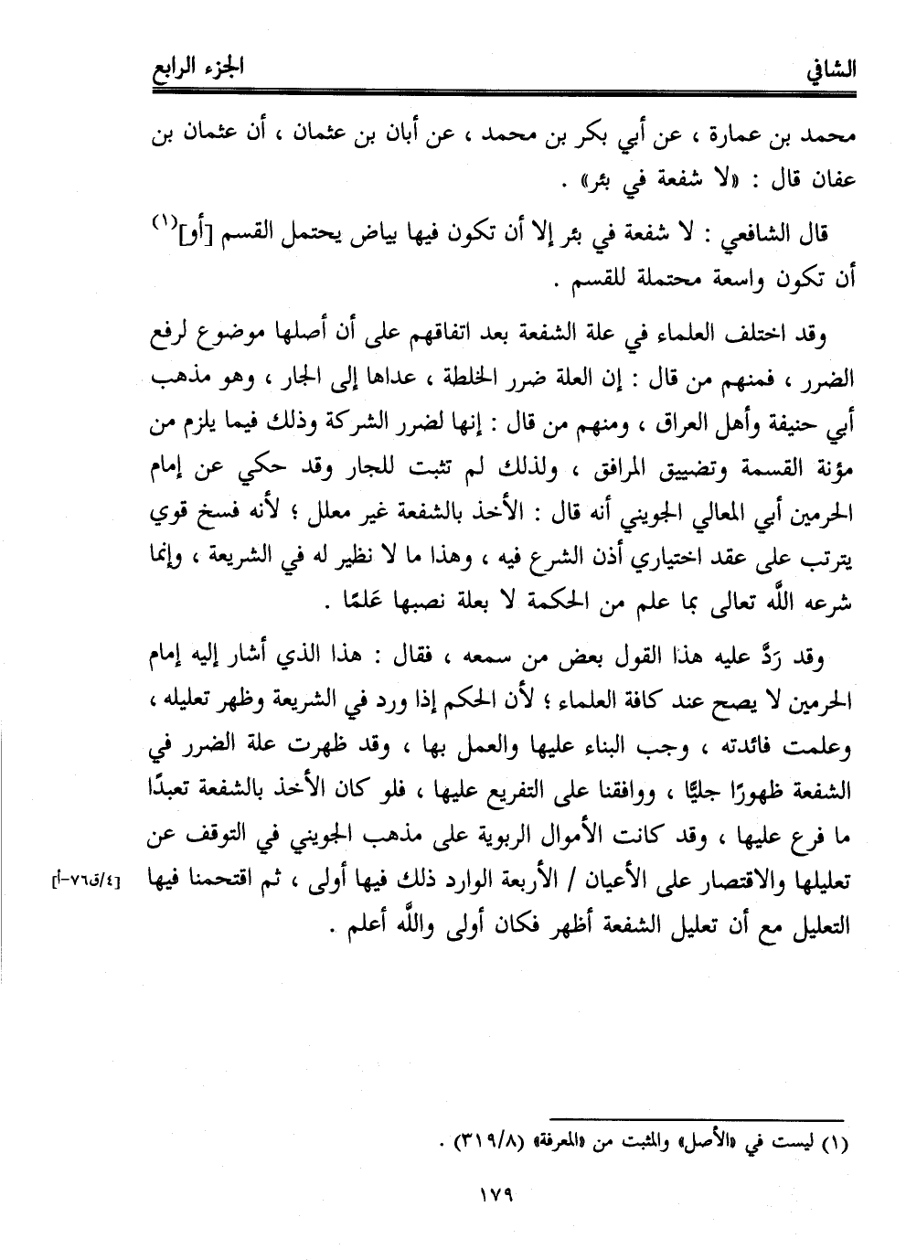 وقد رَدَّ عليه هذا القول بعض من سمعه، فقال: هذا الذي أشار إليه إمام الحرمين لا يصح عند كافة العلماء؛ لأن الحكم إذا ورد في الشريعة وظهر تعليله، وعلمت فائدته، وجب البناء عليها والعمل بها، وقد ظهرت علة الضرر في الشفعة ظهورًا جليًّا، ووافقنا على التفريع عليها، فلو كان الأخذ بالشفعة تعبدًا ما فرع عليها، وقد كانت الأموال الربوية على مذهب الجويني في التوقف عن تعليلها والاقتصار على الأعيان الأربعة الوارد ذلك فيها أولى، ثم اقتحمنا فيها التعليل مع أن تعليل الشفعة أظهر فكان أولى والله أعلم.