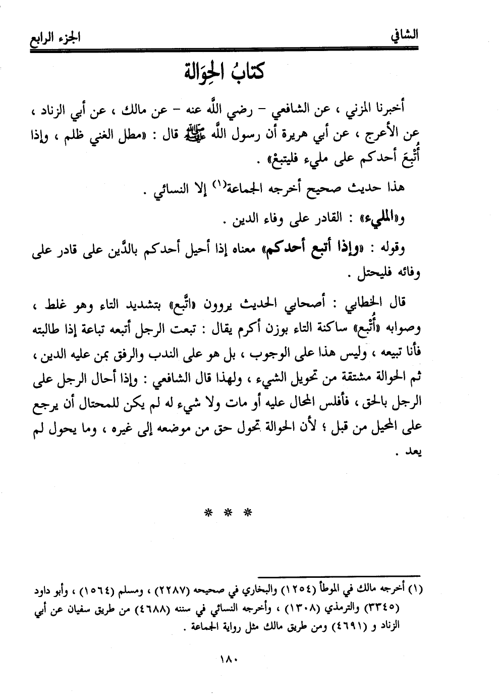 أخبرنا المزني، عن الشافعي -رضي الله عنه- عن مالك، عن أبي الزناد، بن الأعرج، عن أبي هريرة أن رسول - صلى الله عليه وسلم - قال: "مطل الغني ظلم، وإذا أُتْبعَ أحدكم على مليء فليتبعْ".