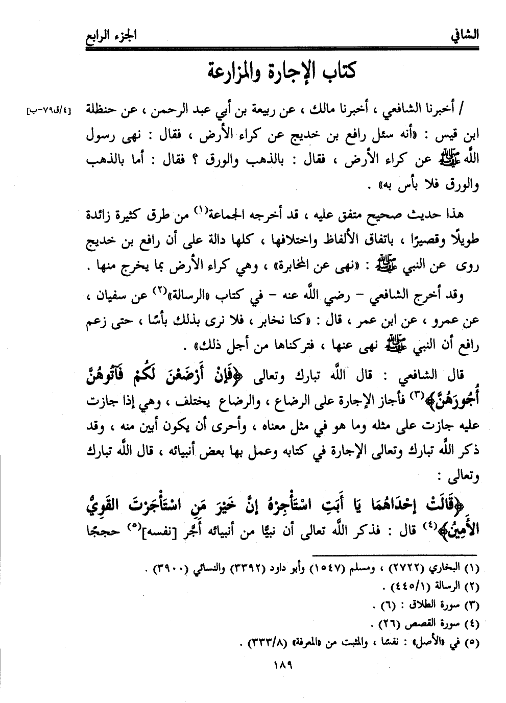 أخبرنا الشافعي، أخبرنا مالك، عن ربيعة بن أبي عبد الرحمن، عن حنظلة ابن قيس: "أنه سئل رافع بن خديج عن كراء الأرض، فقال: نهى رسول الله - صلى الله عليه وسلم - عن كراء الأرض، فقال: بالذهب والورق؟ فقال: أما بالذهب والورق فلا بأس به".