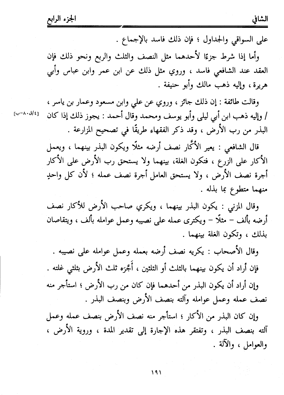 قال الشافعي: يعير الأكَّار نصف أرضه مثلًا ويكون البذر بينهما، ويعمل الأكار على الزرع، فتكون الغلة، بينهما ولا يستحق رب الأرض على الأكار أجرة نصف الأرض، ولا يستحق العامل أجرة نصف عمله؛ لأن كل واحدٍ منهما متطوع بما بذله.