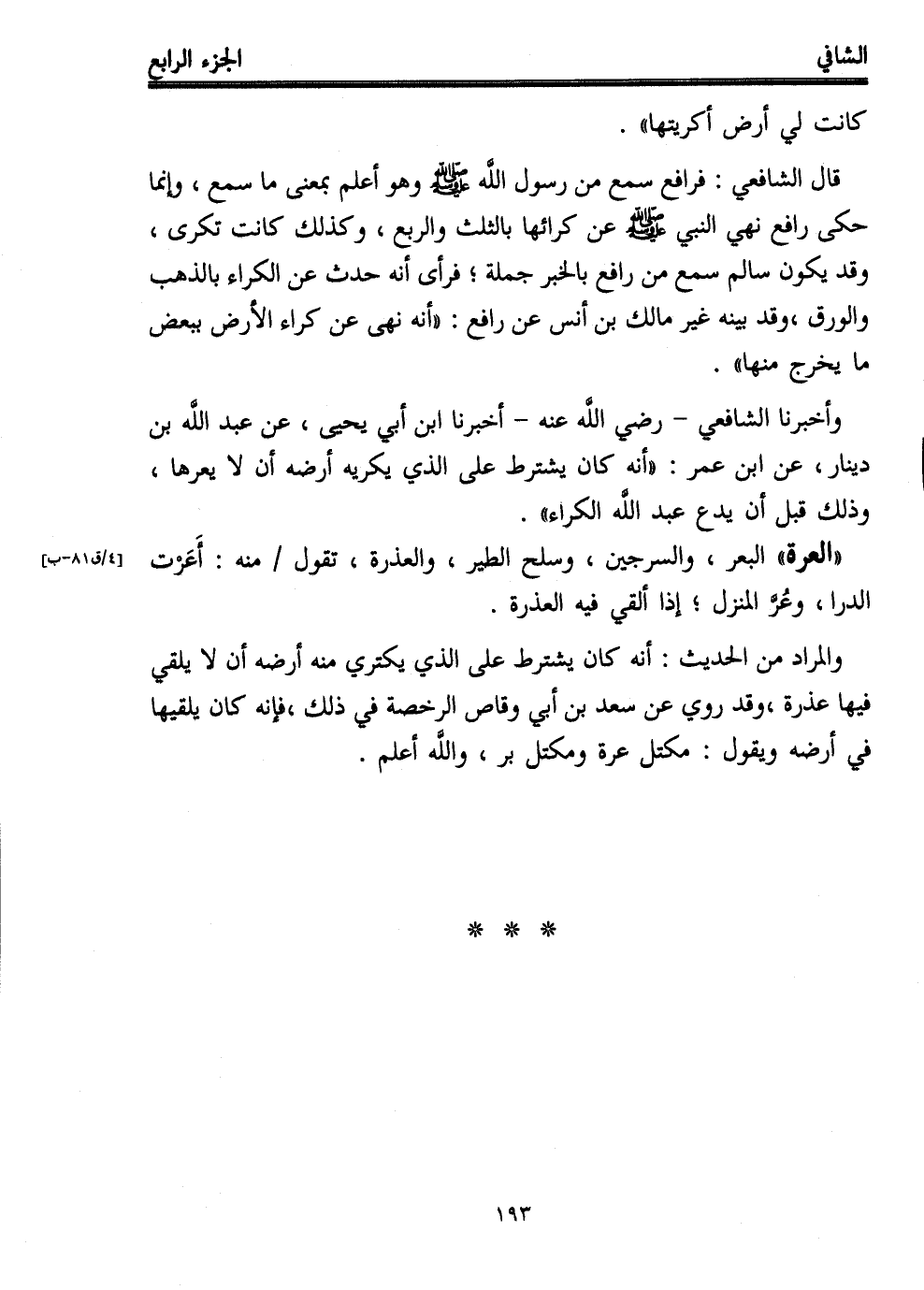 وأخبرنا الشافعي -رضي الله عنه- أخبرنا ابن أبي يحيى، عن عبد الله بن دينار، عن ابن عمر: "أنه كان يشترط على الذي يكريه أرضه أن لا يعرها، وذلك قبل أن يدع عبد الله الكراء".
