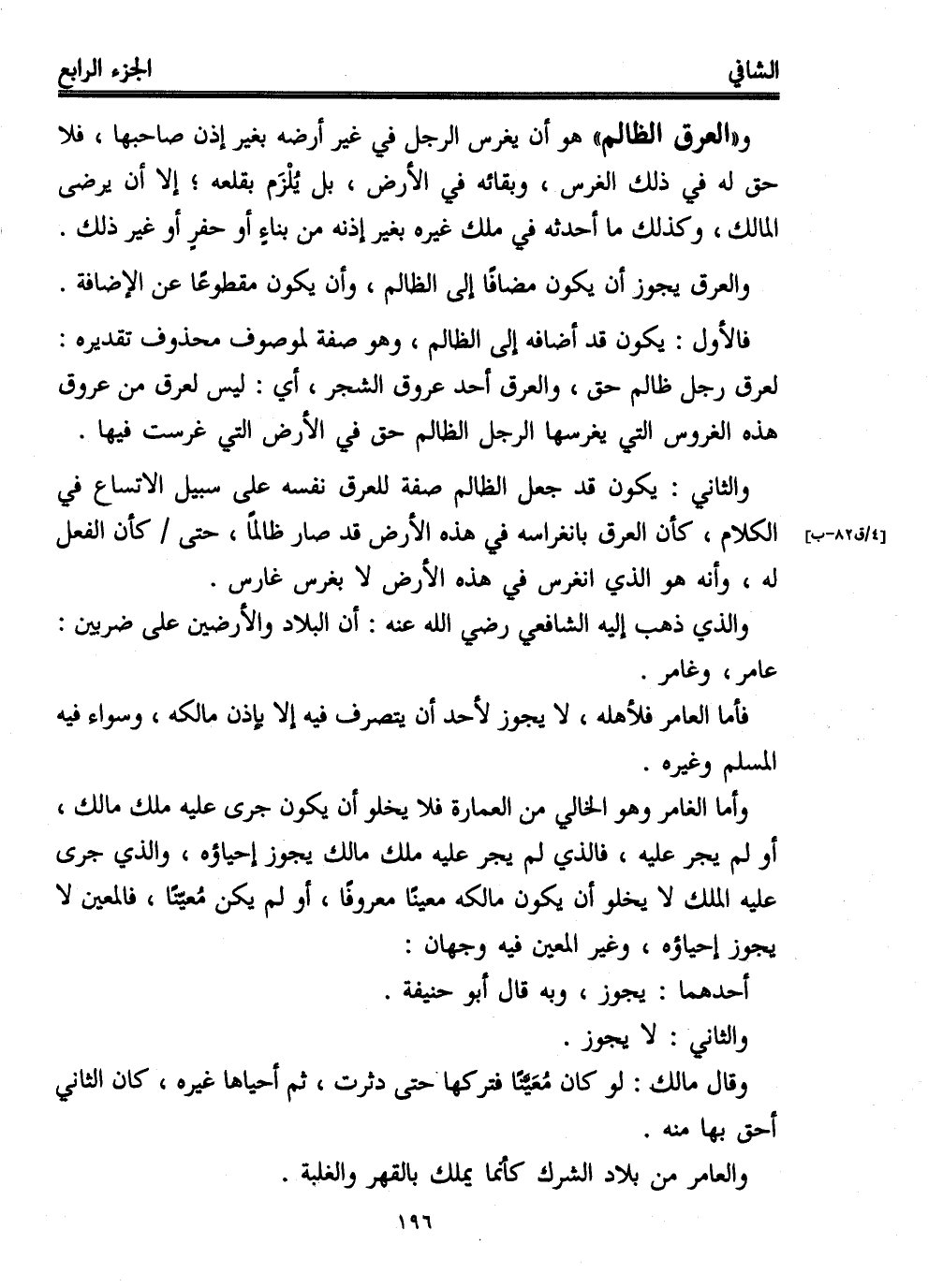 و"العرق الظالم" هو أن يغرس الرجل في غير أرضه بغير إذن صاحبها، فلا حق له في ذلك الغرس، وبقائه في الأرض، بل يُلْزَم بقلعه؛ إلا أن يرضى المالك، وكذلك ما أحدثه في ملك غيره بغير إذنه من بناءٍ أو حفرٍ أو غير ذلك.