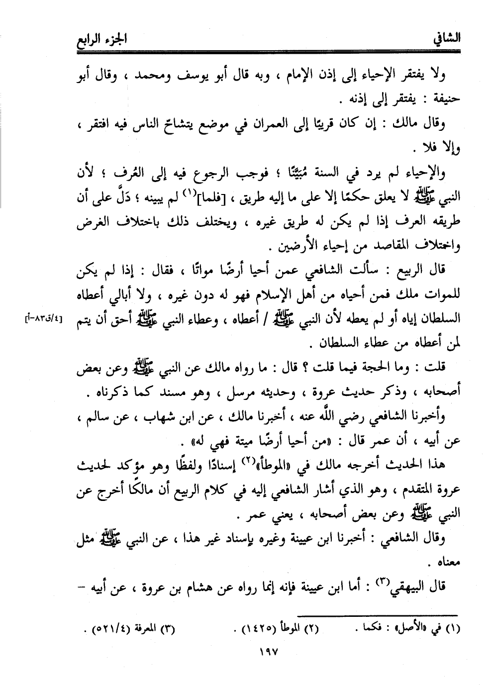 وأخبرنا الشافعي -رضي الله عنه-، أخبرنا مالك، عن ابن شهاب، عن سالم، عن أبيه، أن عمر قال: "من أحيا أرضًا ميتة فهي له".