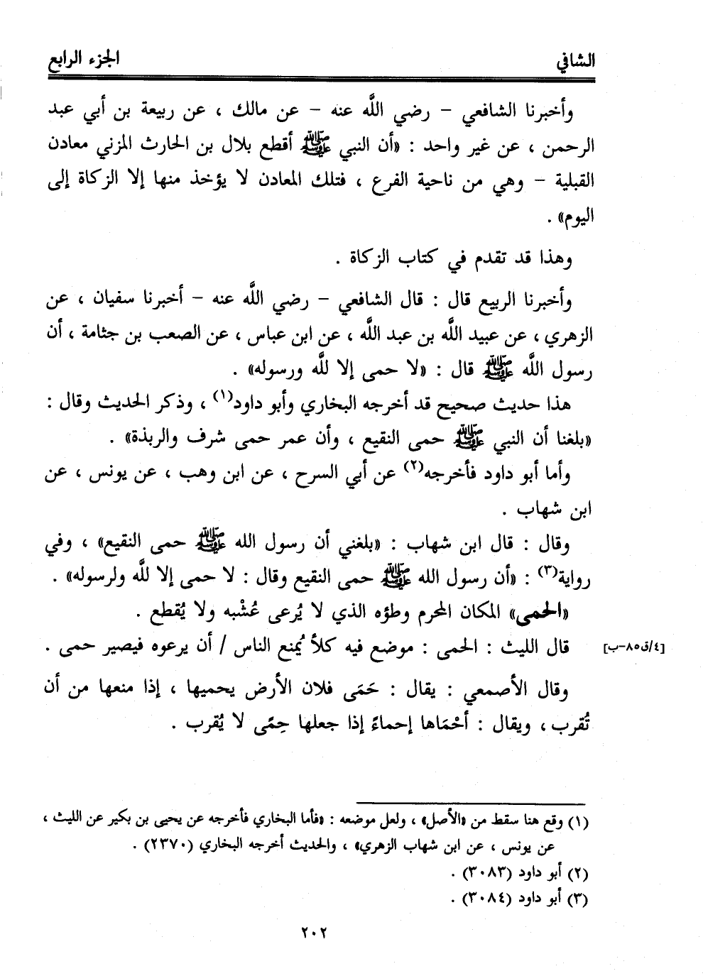 وأخبرنا الربيع قال: قال الشافعي -رضي الله عنه- أخبرنا سفيان، عن الزهري، عن عبيد الله بن عبد الله، عن ابن عباس، عن الصعب بن جثامة، أن رسول الله - صلى الله عليه وسلم - قال: "لا حمى إلا لله ورسوله".
